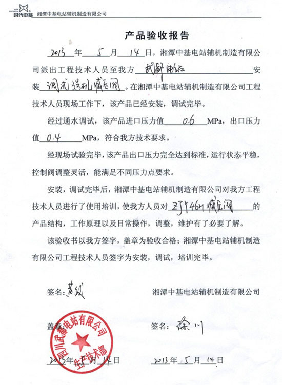 業(yè)主評(píng)價(jià):通過調(diào)試試驗(yàn),3號(hào)機(jī)ZJY46H-16減壓閥工作正常,運(yùn)行良好!