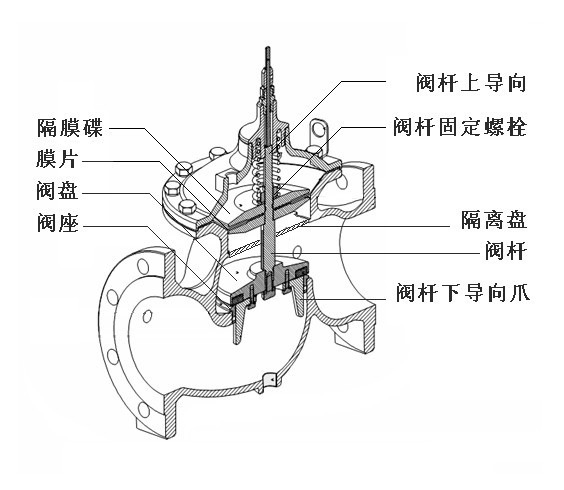 當P1上升時,減壓閥的P2+ΔP2首先表現為上升,其值通過反饋系統出口管傳到控制閥,使Pt′+ΔPt′,ΔPt′與Pk′的力達到新的平衡,控制閥h減小;相應ΔPk′壓力增大,經壓力導管,使主閥的Pk+ΔPk,Pt=Pk+ΔPk壓力達到新的平衡,主閥h減小、ΔP2值恢復為原P2值。當進口壓力P1下降時,主閥與控制閥的工況則與上述的工況相反。